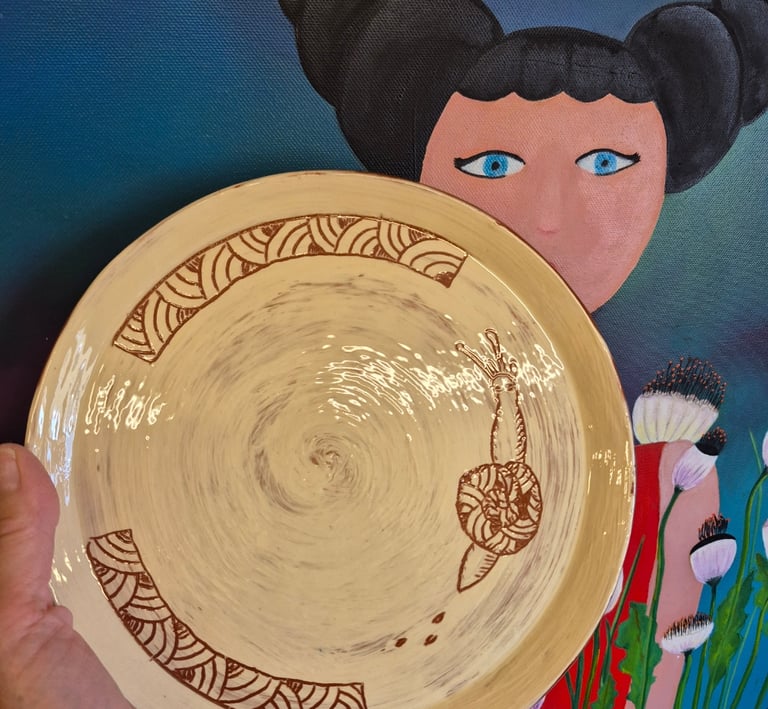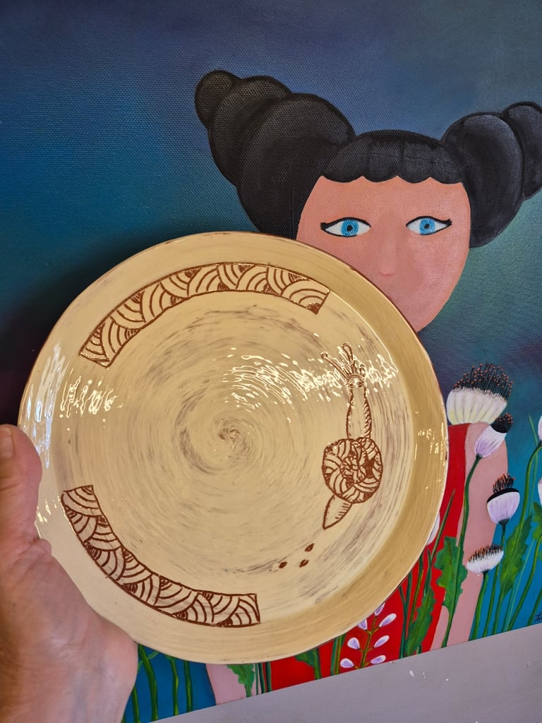 Vous commencerez par réaliser une plaque. A partir d'un gabarit, vous découperez vos assiettes et les mettrez en forme. Un petit temps de séchage accéléré s'impose avant d'appliquer l'engobe de fond. Ensuite laissez libre cours au dessin de vos assiettes.